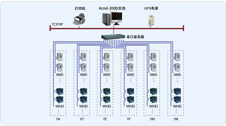 監控系統主要監控多晶鑄20kV高壓、0.4 kV低壓,該系統總計有159只儀表(其中包括142只進線保護,2只PT保護、8只變壓器保護、6只溫控儀),共10條總線,低壓變電所和高壓室離值班室距離不遠,直接采用屏蔽雙絞線連接至串口服務器,再通過網線連接到網絡交換機上,監控主機通過網絡交換機實現總線上儀表與監控主機的數據連通。