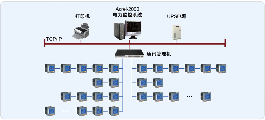 采用Acrel-3000電能管理系統(tǒng)實現(xiàn)遠(yuǎn)程電參量(電流,電壓,功率,功率因素等)實時監(jiān)測與分類電能計量。以現(xiàn)場測得的最大需量(MD)與系統(tǒng)預(yù)先設(shè)定的需量限定值進(jìn)行比較,在超量時報警。監(jiān)控系統(tǒng)主要分為3層:站控管理層(工控機(jī)、打印機(jī)、UPS電源)、通訊管理層(4口通訊管理機(jī))、現(xiàn)場設(shè)備層(現(xiàn)場智能裝置)。現(xiàn)場中的IO設(shè)備的通訊線纜采用RVSP 2*1.5屏蔽雙絞線,連接至4口通訊管理機(jī)。選配ACR220EL/K的多功能儀表,具有 LCD液晶屏顯示,可監(jiān)測三相電流、三相電壓、電網(wǎng)頻率、三相(有功功 率、無功功率、功率因數(shù))、三相有功電能、三相無功電能6項測量參數(shù)。