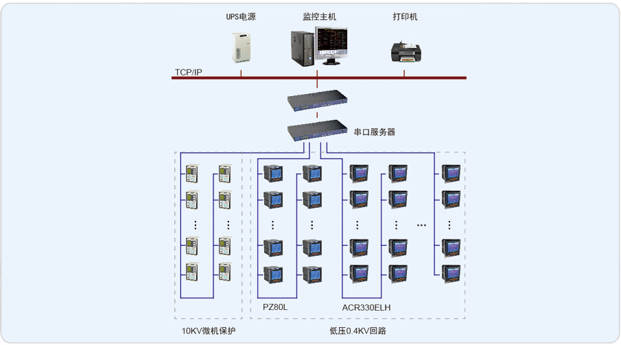 10kV回路的進(jìn)線和饋線配有微機(jī)保護(hù)裝置;0.4kV進(jìn)線和母聯(lián)回路裝有ACR330ELH電網(wǎng)質(zhì)量分析儀,采集回路的常規(guī)電參量、四象限電度和電網(wǎng)質(zhì)量參數(shù);0.4kV饋線回路裝有PZ80L系列多功能電力儀表,采集回路的常規(guī)電參量和四象限電度。本系統(tǒng)儀表集中,所以均通過屏蔽雙絞線手拉手相連數(shù)據(jù)上傳至監(jiān)控主機(jī)。