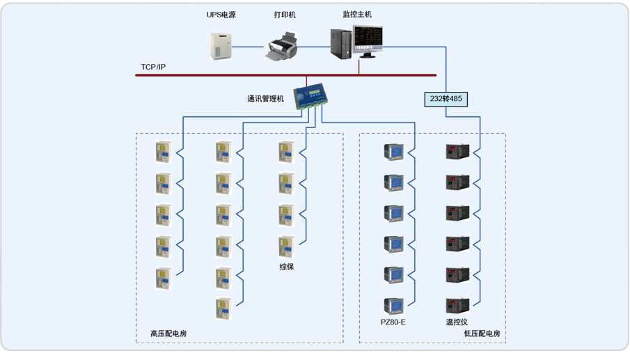 該項目是一個新建廠區(qū)的配電系統(tǒng),包含35KV變壓器2臺,10KV變壓器3 臺,項目中監(jiān)控范圍為35KV線路微機保護裝置2臺,變壓器溫控儀8臺,10KV微機保護裝置12臺,安科瑞智能儀表8臺,本套系統(tǒng)主要強調實時數(shù)據(jù)的監(jiān)測、控制,主要針對整個配電系統(tǒng)可靠性進行全程的智能化監(jiān)控,數(shù)據(jù)分析,投、斷,以及對各回路所用電能進行統(tǒng)計。