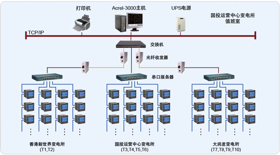 本電能管理系統(tǒng)主要實(shí)現(xiàn)先鋒國(guó)際廣場(chǎng)三個(gè)變電所的0.4kV配電系統(tǒng)的用電監(jiān)測(cè)與電能管理;監(jiān)測(cè)范圍為香港新世界變電所的T1、T2,國(guó)投運(yùn)營(yíng)中心變電所的T3、T4、T5、T6,以及大潤(rùn)發(fā)變電所的T7、T8、T9、T10變壓器的低壓進(jìn)線柜、聯(lián)絡(luò)柜、饋線柜中的智能電力儀表,從而實(shí)現(xiàn)遠(yuǎn)程實(shí)時(shí)監(jiān)測(cè)和電能管理。該系統(tǒng)總計(jì)有420只PZ80-E4/C儀表,分20條總線,由于三個(gè)變電所之間距離較遠(yuǎn),并且較為分散,采用每個(gè)變電所內(nèi)自行組網(wǎng),然后通過先鋒國(guó)際的視頻監(jiān)控光纖傳至到國(guó)投運(yùn)營(yíng)中心的消控中心,通過光電轉(zhuǎn)換器和交換機(jī),連接至監(jiān)控電腦,實(shí)該現(xiàn)場(chǎng)總線上儀表與監(jiān)控主機(jī)的數(shù)據(jù)連通。