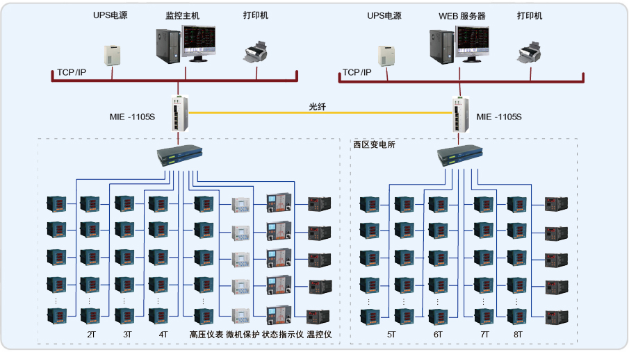 該項目監控系統主要實現吳中商務中心兩個地下變電所(東區變電所和西區變電所)的10/0.4kV配電系統進行用電監控與電能管理;監控范圍為東區變電所的T1、T2、T3、T4變壓器的低壓進線柜、聯絡柜、饋線柜及高壓側儀表和西區變電所的T5、T6、T7、T8變壓器的低壓進線柜、聯絡柜、饋線柜儀表進行遠程實時監控和電能管理。