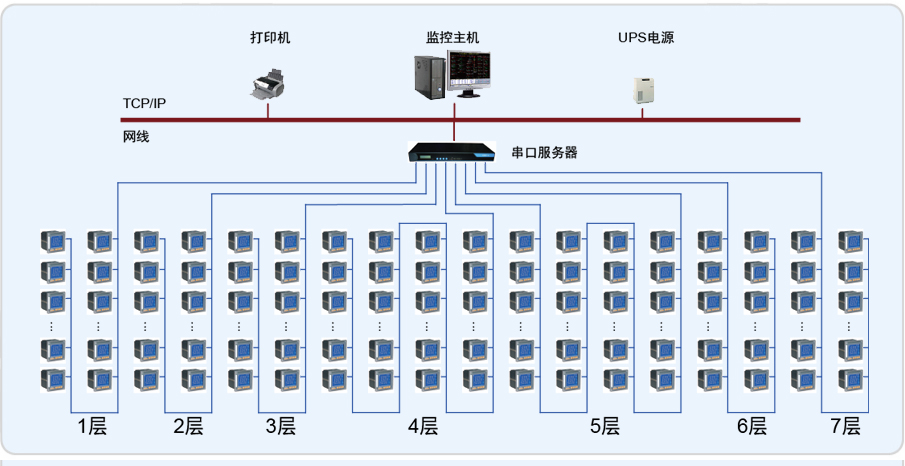 本項(xiàng)目電力監(jiān)控系統(tǒng)采用分布式結(jié)構(gòu),為現(xiàn)場(chǎng)層、通訊層和后臺(tái)監(jiān)控層?,F(xiàn)場(chǎng)層指分布于于各樓層動(dòng)力箱及地下配電室內(nèi)的安科瑞系列儀表,通訊層包括NPORT5630-16串口服務(wù)器、網(wǎng)絡(luò)交換機(jī)等,后臺(tái)監(jiān)控層包括計(jì)算機(jī)、打印 機(jī)、UPS電源等。通訊層及后臺(tái)監(jiān)控層都位于地下監(jiān)控室內(nèi)。現(xiàn)場(chǎng)所有安科瑞系列儀表通過屏蔽雙絞線拉到地下監(jiān)控室內(nèi),與串口服務(wù)器相連,經(jīng)交換機(jī)與計(jì)算機(jī)連接,實(shí)現(xiàn)數(shù)據(jù)采集。