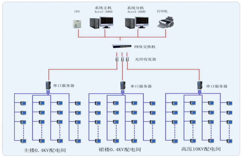 系統(tǒng)采用Acrel-2000型電力監(jiān)控系統(tǒng),整個系統(tǒng)采用網(wǎng)絡(luò)分布式結(jié)構(gòu),包含主樓0.4KV低壓配電室,裙樓0.4KV低壓配電室,10KV高壓配電室三個區(qū)域,3個數(shù)據(jù)采集箱。監(jiān)控主機(jī)位于主樓地下一層的辦公室,監(jiān)控分機(jī)位于主樓一層的消控中心,所有配電回路均配備安科瑞電力儀表PZ系列。該項目實現(xiàn)了福州郵政廣場2棟樓內(nèi)電力系統(tǒng)的智能管理。所有監(jiān)控設(shè)備均通過屏蔽雙絞線至各自配電室內(nèi)的串口服務(wù)器,再通過光電轉(zhuǎn)換器經(jīng)過光纖將數(shù)據(jù)傳輸至主樓地下一層的辦公室,從而實現(xiàn)遠(yuǎn)程監(jiān)控。